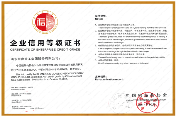 荣获2014-2016年中国建筑钢结构行业推荐品牌信誉AAA企业。