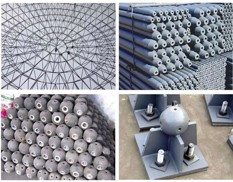 网架结构的杆件截面应根据强度和稳定性计算确定。为减小压杆的计算长度增加其稳定性,可采用增设再分杆及支撑杆等措施。用钢材制作的板型网架及双层壳型网架的节点,主要有十字板节点、焊接空心球节点及螺栓球节点三种形式。十字板节点适用于型钢杆件的网架结构,杆件与节点板的连接,采用焊接或高强螺栓连接。空心球节点及螺栓球节点适用于钢管杆件的网架结构。单层壳型网架的节点应能承受弯曲内力,一般情况下,节点的耗钢量占整个钢网架结构用钢量的15~20%。