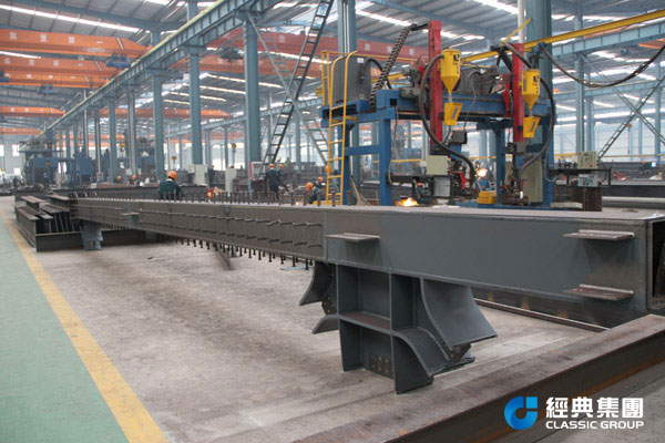 3.腹板装配前须检查腹板的平直度,装配时采用一个方向装配,先定位中部加劲板,后定位腹板。