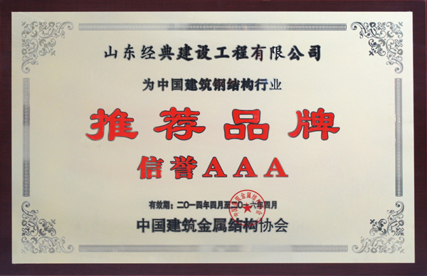 荣获2014-2016年中国建筑钢结构行业推荐品牌信誉AAA企业。