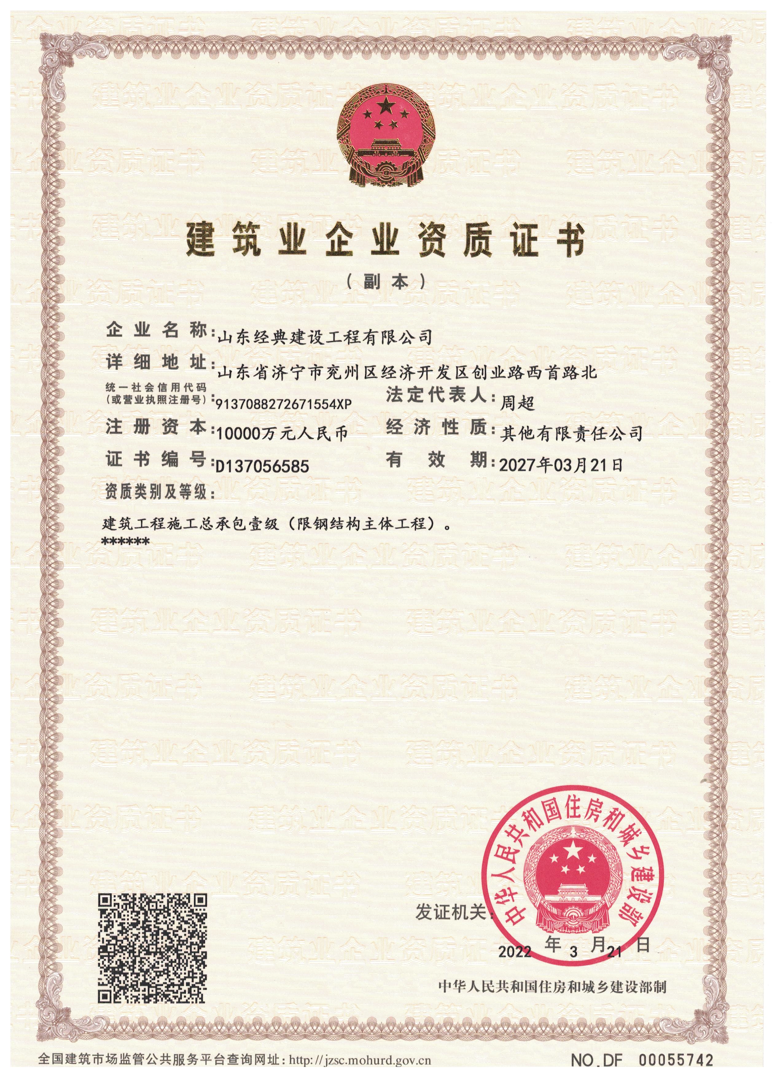 2022年3月,山东经典建筑AYX爱体育有限公司荣升建筑AYX爱体育施工总承包壹级资质